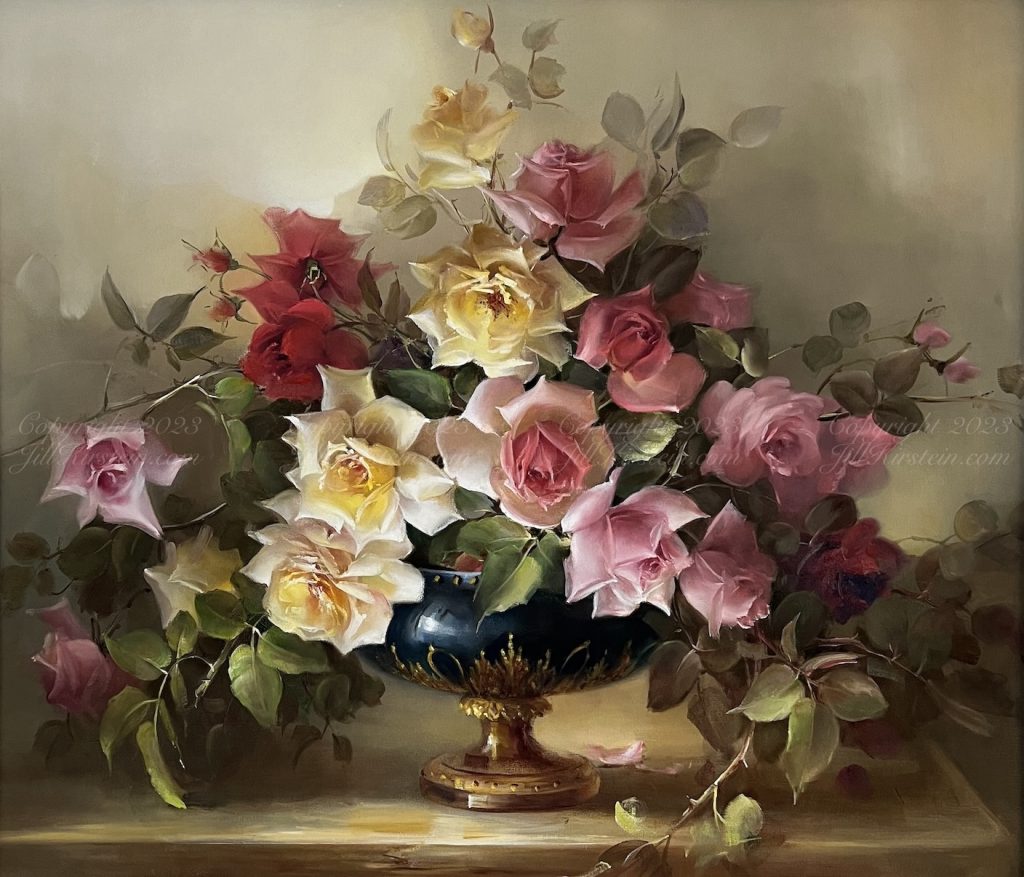 Jill’s encounter with the renowned Belgian artist, Maurice Verelste, during the early 1980s left a profound impact on her. Maurice, known for his exquisite floral paintings in the old masters’ style, served as a great inspiration to Jill. Under his guidance, she embarked on a journey to discover and nurture her distinct artistic style. Rapidly, Jill ascended within the community of accomplished artists and went on to showcase her work in numerous solo exhibitions, reaching art enthusiasts across Australia.